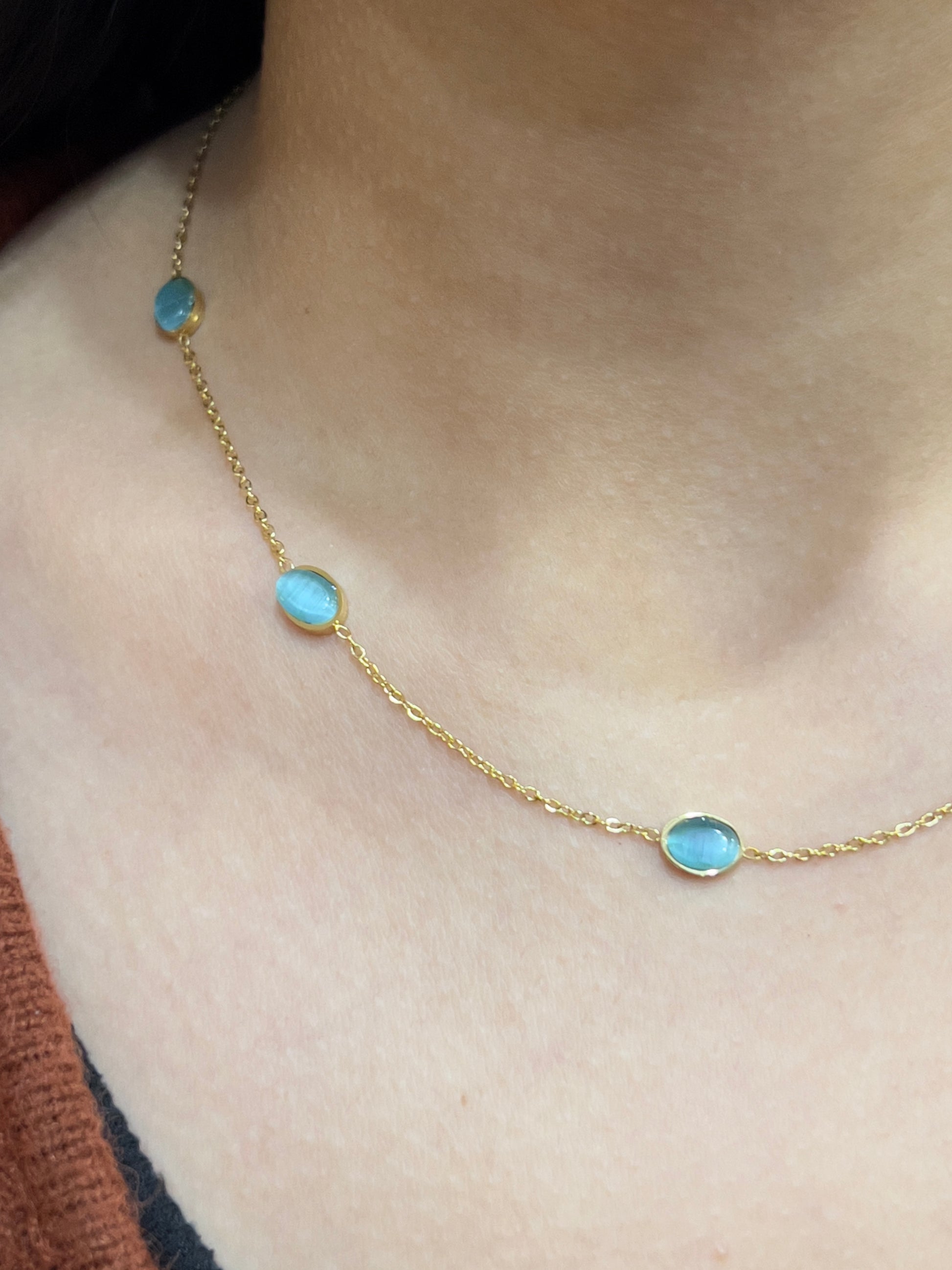 The Ocean Spark Necklace features delicate round blue stones set along a fine gold-finish chain, inspired by the calm glow of ocean hues. Lightweight and graceful, it adds a soft pop of colour while remaining easy to style for everyday wear. Finished with an anti-tarnish coating, this necklace is waterproof, hypoallergenic, and gentle on sensitive skinâperfect for daily elegance.